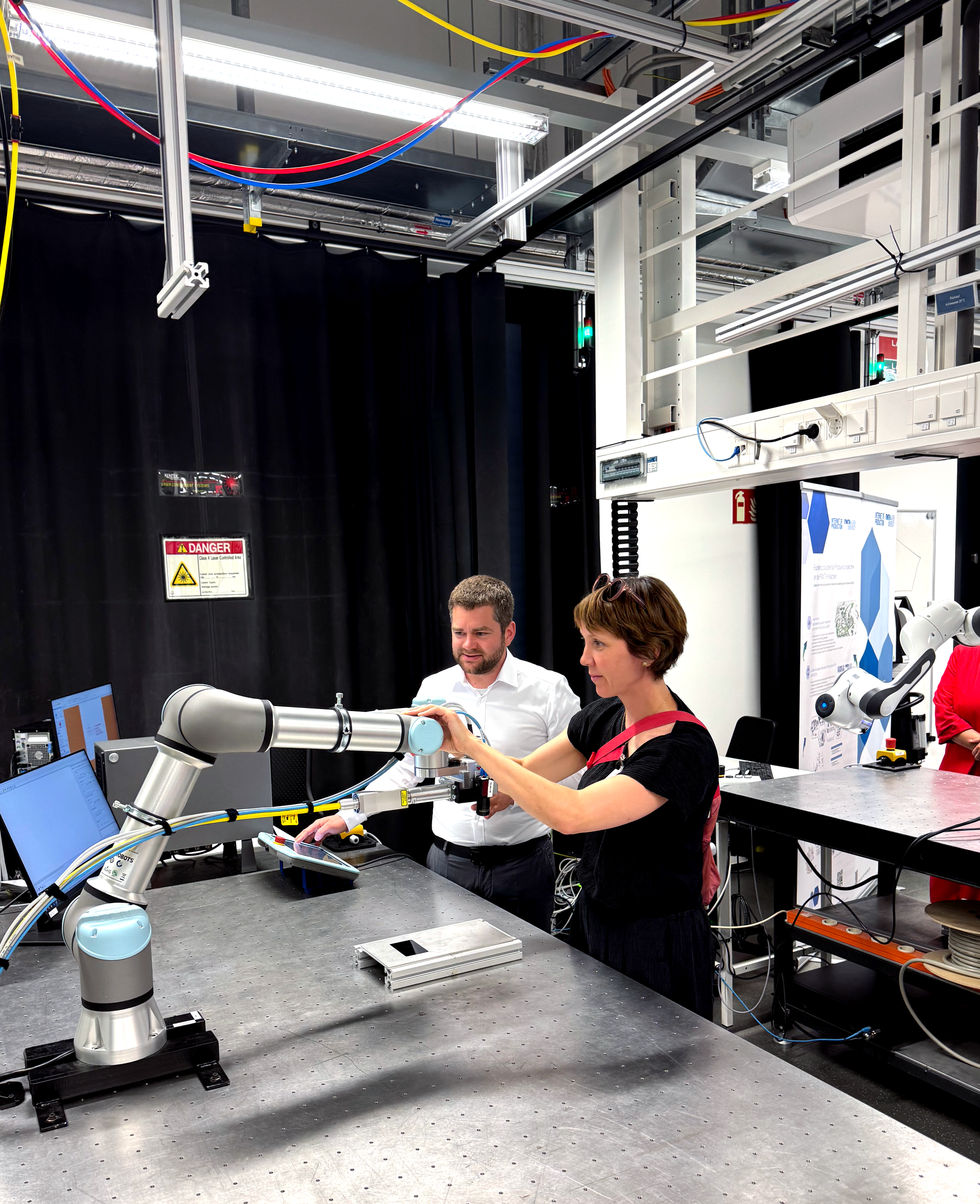 An der „BUSCH-Anlage“ präsentierten Lucas de Andrade Both und Maria Regiani, wie die gemeinsame Nutzung der Infrastruktur des Forschungscampus DPP Anwendung finden kann, etwa bei der Fertigung extrem langer Schweißnähte oder Strukturen für Batterien und Brennstoffzellen. Die SCANLAB GmbH stellte hierfür einen Galvanometer-Scannerkopf und flexible Software-Schnittstellen zur präzisen Steuerung bereit. Neue Algorithmen ermöglichen eine synchronisierte Steuerung zusätzlicher Scan-Achsen und Strahlformer. Ergänzend lieferte die BUSCH Microsystems GmbH ein fortschrittliches Achsensystem, um die Trajektorienplanung zu testen, während die EdgeWave GmbH die Laserquelle für die Validierung der Ansätze bereitstellte.