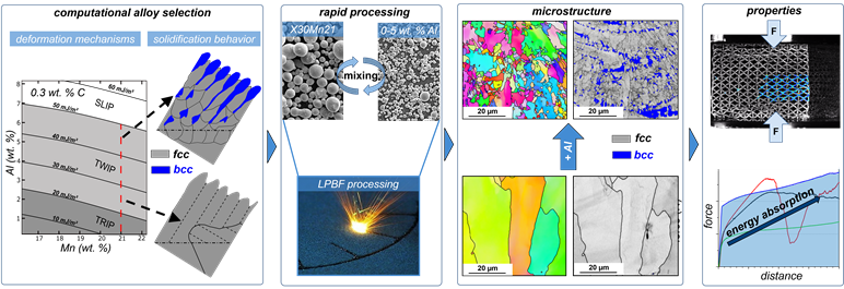 Herr Dr. Köhnen legte seinen Forschungsschwerpunkt in den letzten fünf Jahren auf die Legierungsentwicklung für die additive Fertigung. Dazu eignete er sich in kürzester Zeit die materialwissenschaftlichen Grundlagen hochlegierter Stähle, Nickelbasislegierungen sowie Erstarrungs- und Plastizitätstheorien an. Mit Fachwissen und Kreativität gelang es ihm, die von ihm neu entwickelten Stähle so zu manipulieren, dass sowohl deren Mikrostruktur, kristallographische Textur als auch die mechanischen Eigenschaften gezielt festgelegt werden können. Das gezielte Einstellen der mechanischen Eigenschaften von additiv gefertigten Stählen hat dabei eine hohe Relevanz für die industrielle Nutzung der additiven Fertigung, bzw. bei der Herstellung von geometrisch komplexen Gitterstrukturen für Leichtbauanwendungen mit hoher Energieabsorption.